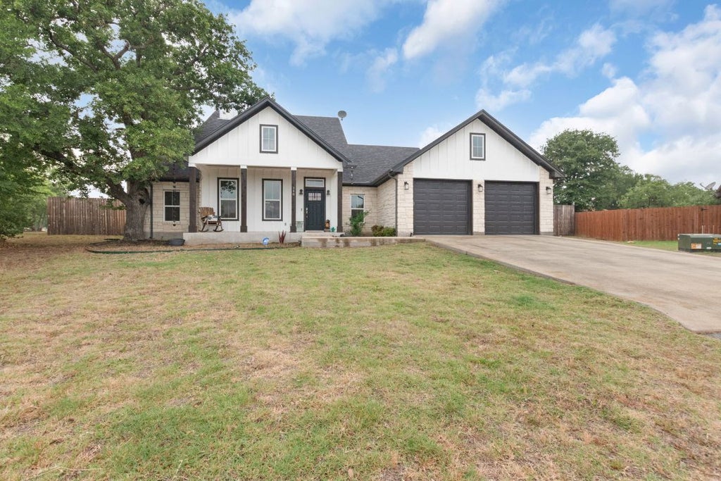 Step into this stunning 3-bedroom, 2-bath modern farmhouse in the coveted Granite Ridge community. Built in 2020, this home offers an open layout with soaring vaulted ceilings and a stone fireplace that anchors the living space. The gourmet kitchen is designed to impress, featuring quartz countertops, a large island, stainless steel appliances, and ample cabinetry with subway tile backsplash. Relax in the spacious primary suite complete with tray ceilings, plush carpeting, and a luxurious bath boasting dual vanities, a walk-in shower with custom tile, separate water closet, and a generous walk-in closet. Two additional bedrooms provide versatile space for family, guests, or a home office. Enjoy the inviting secondary bath with classic tub/shower combo and tasteful finishes. The fenced backyard and covered patio create a private outdoor retreat. Practical details include insulated windows, sprinkler system, and an attached 2-car garage. Located just minutes from golfing at The Lighthouse Golf Course, this home blends upscale comfort with unbeatable convenience.